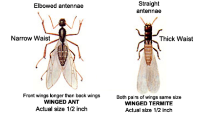 One of the most commonly mis-identified pests by folks not in this industry are Ants and Termites. The reproductive swarmers represented below have been often identified wrong because of their similiar characteristics. The easiest way of identifying these two to the untrained eye, would be the waistlines, the difference is obvious.